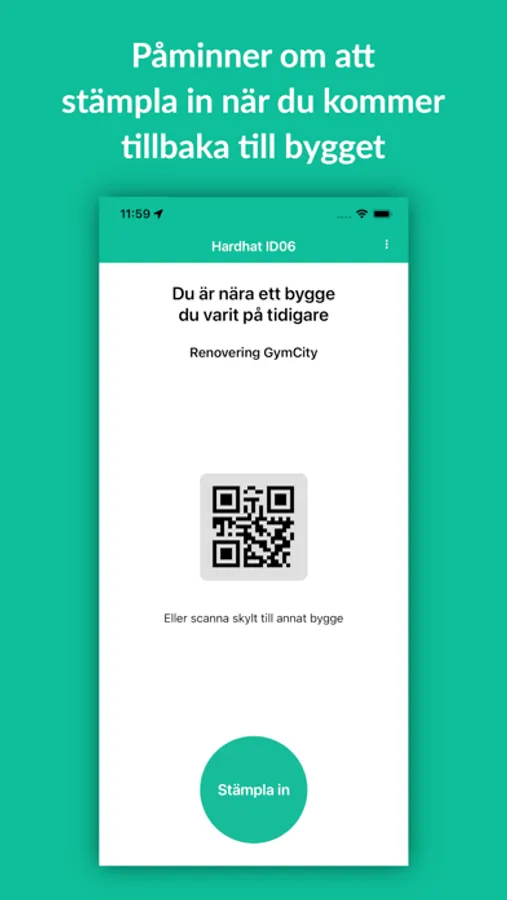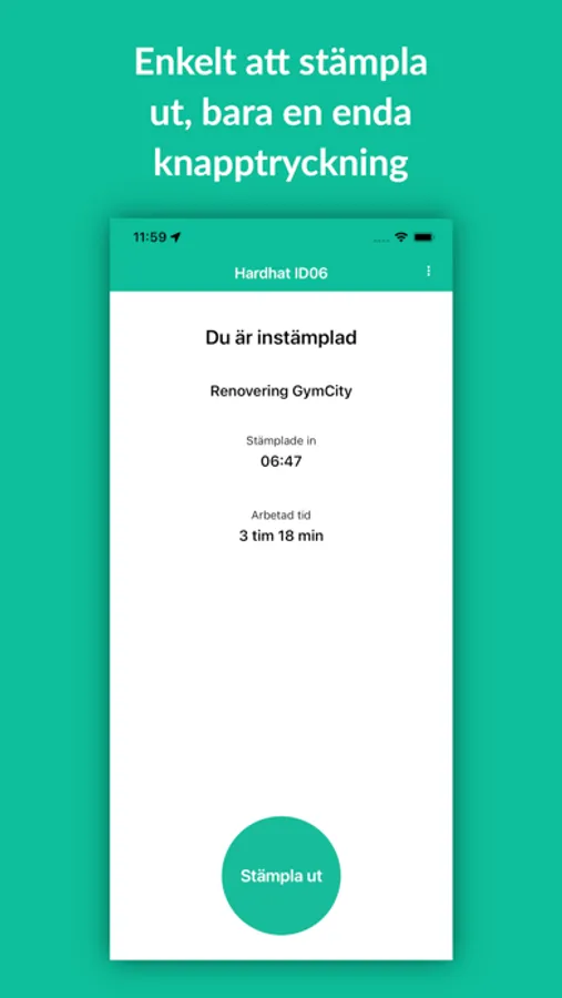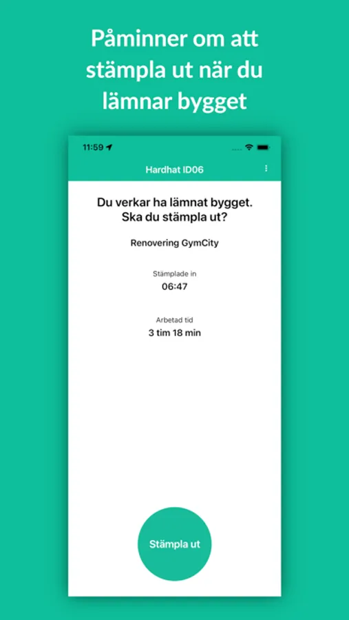 Hardhat ID06 är det smidigaste sättet att ha en personalliggare i fickan. Enkelt att stämpla in, enkelt att stämpla ut. Om du skulle lämna bygget utan att stämpla ut så hjälper appen dig med en påminnelse. När du kommer tillbaka så får du en påminnelse om att stämpla in. Aldrig tidigare har det varit så lätt att göra rätt med stämpelklockan på bygget.
