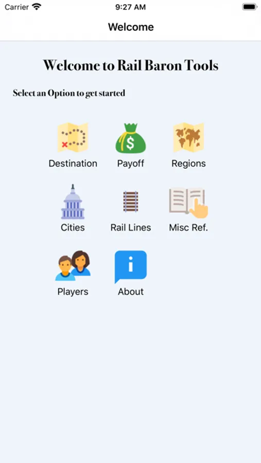 Rail Baron Tools, is an Rail Baron reference app that takes the drudgery out of this, by allowing you to quickly look up the data you need, and helping you to optimize your decision making and strategies. Rail Baron Tools does not replace the game (i.e. you still play on the game board, using the actual playing pieces, money, dice etc.), but is meant to enhance it. The app provides data based on the 1977 edition Game published by The Avalon Hill Game Co.