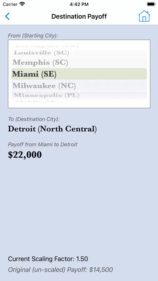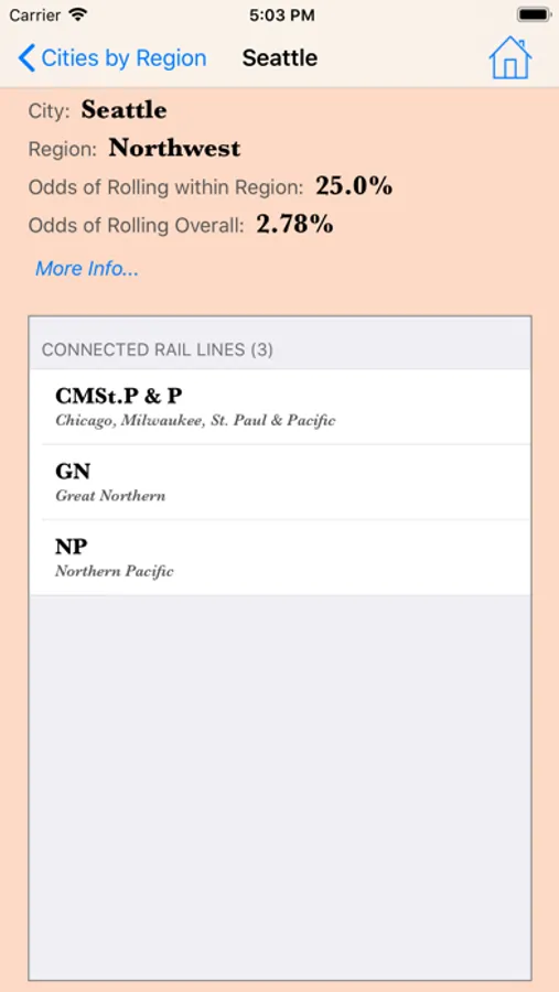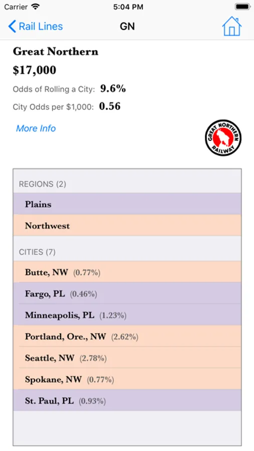 - View detailed Railroad information, including Price, Cities along the Railroad, and odds of rolling a City on the Railroad