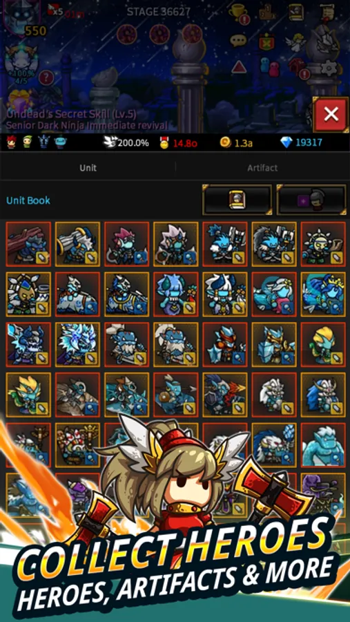 Tap through the stages and build your units from over a hundred available characters. Endless battles put your strategy to the test, or you can sit back and watch your heroes fight through thousands of stages!