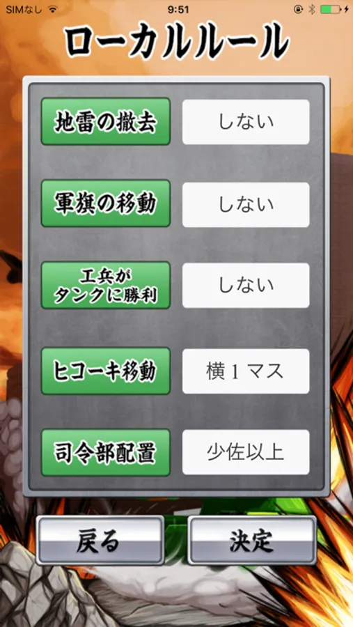 [軍旗が移動可能]や[司令部を少尉以上で占領可能]など、設定の変更により様々なローカルルールに対応。