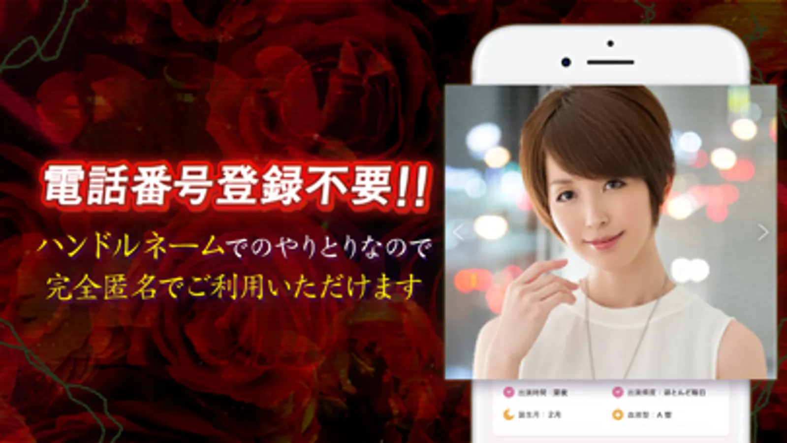 完全匿名のハンドルネーム制なので、あなたの個人情報が相手に知られる事はありません。