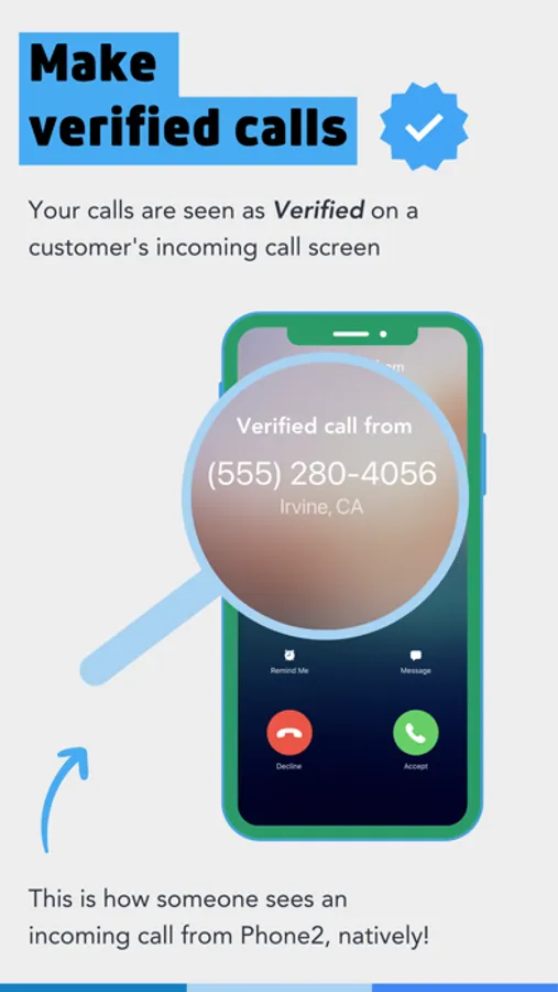 When making calls from a Phone2 phone number, the person receiving the call will see it as "Verified" and no "Spam". This is what makes us different from all the other phone apps on the App Store. Step up your business image with verified phone calls that are 2x more likely to be answered!