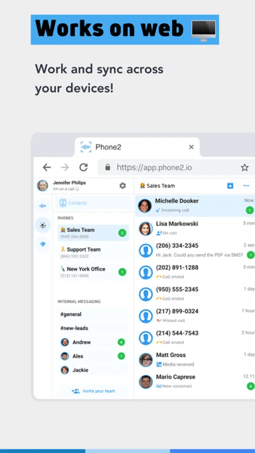 Calling and texting is no longer limited to your small screen. Use our beautiful web version to call and text as well. And all of your Phone2 messages and call history will sync between your devices.