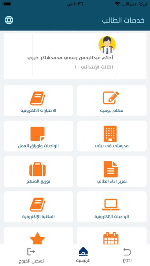 الخدمات الطلابية (الواجبات الإلكترونية، واجبات وأوراق العمل، والتواصل مع المعلم، والبريد، وتوزيع المناهج الدراسية، وتوزيع المناهج والتقارير الأكاديمية والسلوكية،