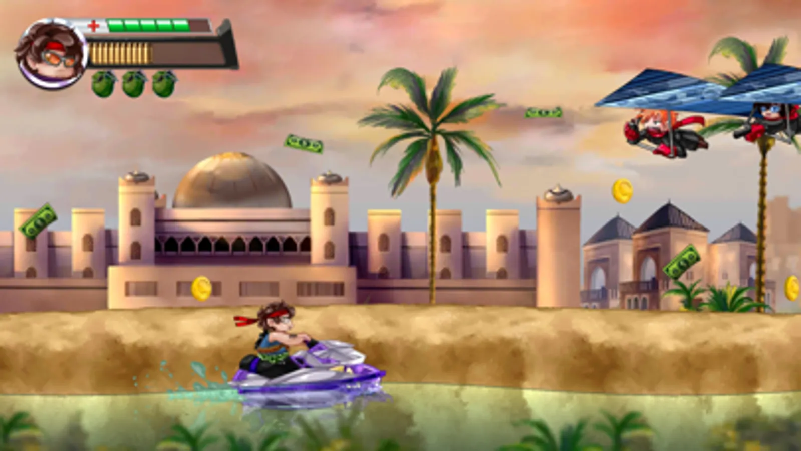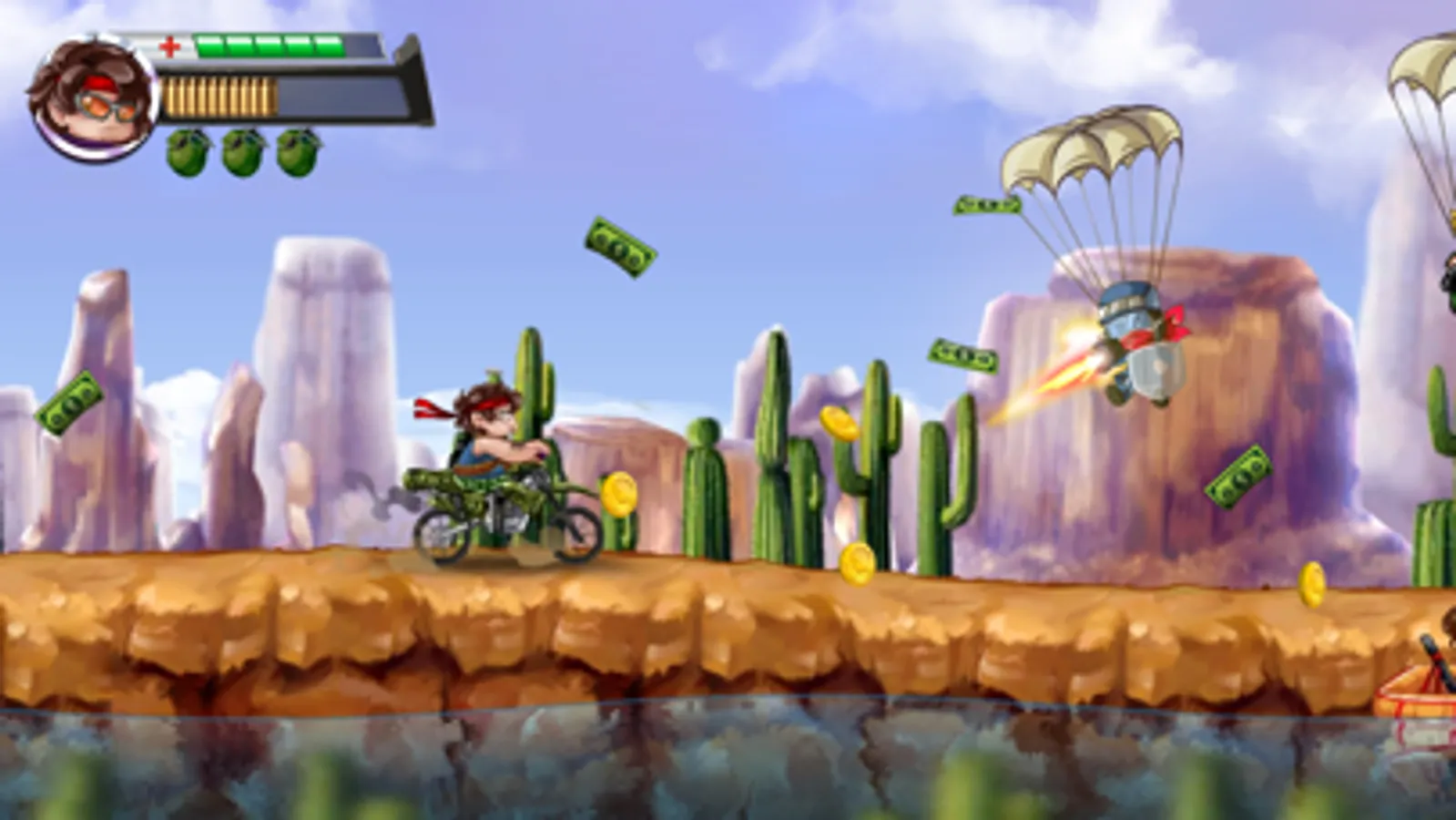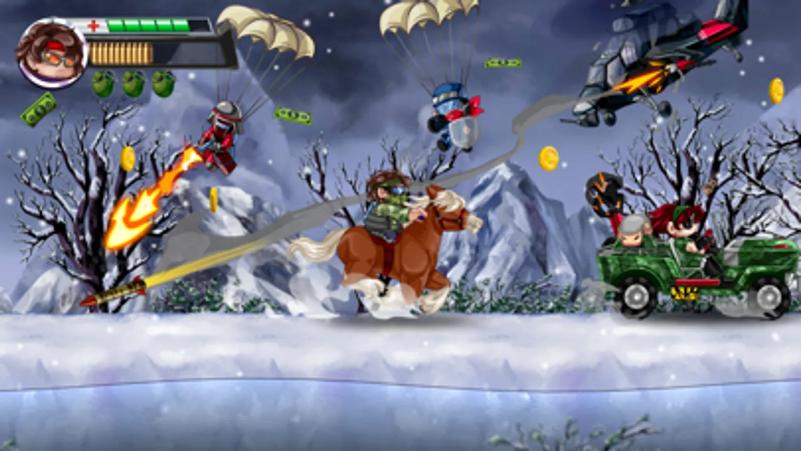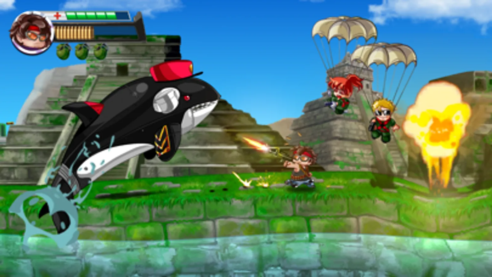 Survive an army of soldiers, paratroopers, rocket launchers and enemy submarines, dodge a hail of bullets while you unload all your arsenal on them. During your run, get power ups to increase your firepower and collect coins to upgrade your guns & craft new gears.