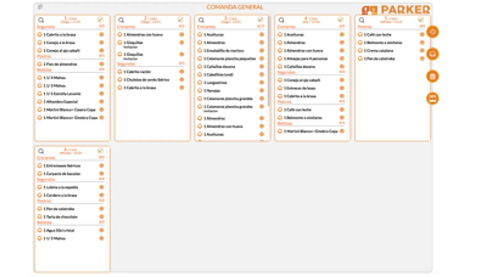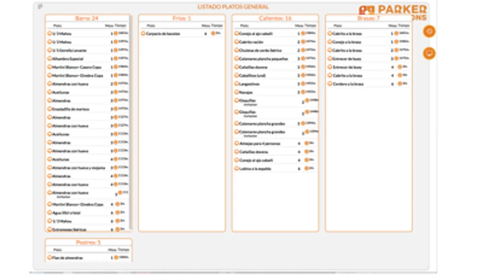 Gestiona los platos pedidos por partidas y por mesa, confirma cuando están listos y recibe las reclamaciones.