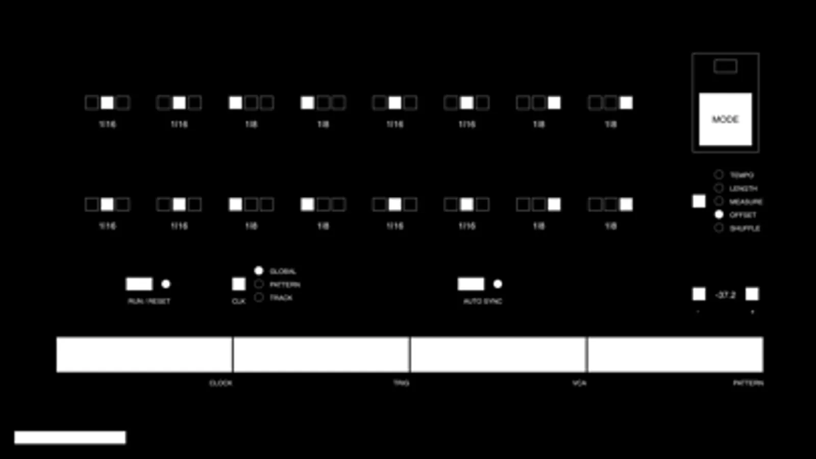 - Programmable Clock Pattern per Track with NOTE LENGTH (straight, shuffled or aligned to measure) per Step