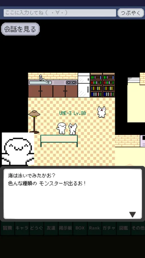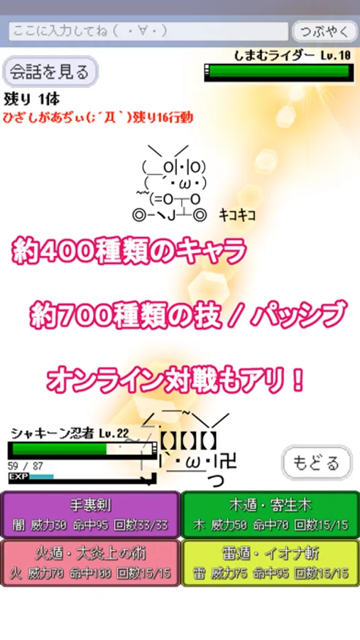 「モナモン」はアスキーアート(AA)のキャラを引き連れて冒険に出かけるゲームです