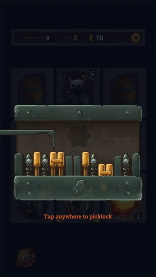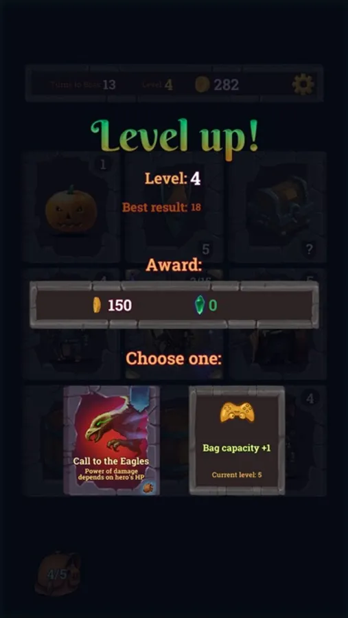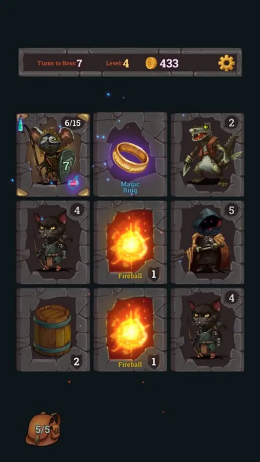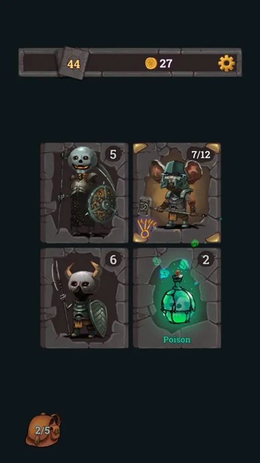 Defeat a boss and add difficulty to the game and upgrade the hero. Get a chest as a reward. Take care: among useful cards one can meet dangerous ones, like poison, for example.
