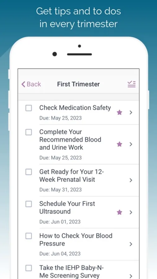 • TO DOS | See To Dos based on your pregnancy weeks and trimesters. Learn about health benefits to help you stay on track during pregnancy