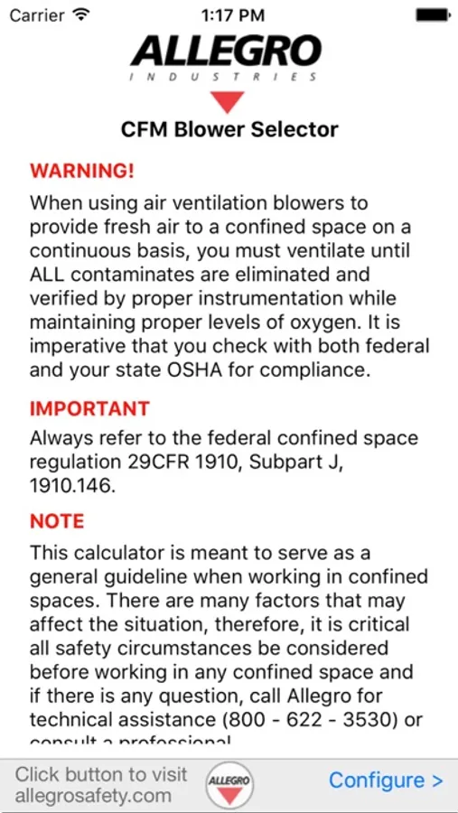 The Allegro CFM Blower Selector App takes into account the type of confined space environment you’re working in and its size to choose the proper Allegro blower that will best suit your needs. Allegro Blowers will then be displayed in green that provide the air flow and CFM (Cubic Feet per Minute) needed to properly ventilate the confined space.