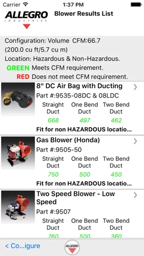 4. The app displays a list of Allegro Blowers that meet that requirement in green. Any that DO NOT meet the requirement are listed in red.