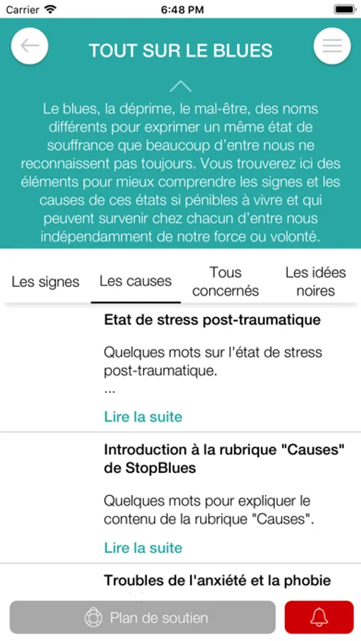Tout le monde peut un jour se sentir seul, fatigué, déprimé, découragé et en souffrir. Mais toute situation a des solutions : téléchargez gratuitement StopBlues, l’application qui agit pour votre bien-être !Tout le monde peut un jour se sentir seul, fatigué, déprimé, découragé et en souffrir. Mais toute situation a des solutions. StopBlues est un site internet qui permet d'accéder rapidement à une panoplie d'informations et d'outils pour mieux comprendre la situation et trouver des solutions pour soi-même ou pour un proche. Des vidéos informent sur le blues, le mal être et la souffrance, leurs signes, leurs causes, les solutions et les aides et actions possibles. Ceux qui en ont besoin bénéficient de conseils et d’outils pour aller mieux et les accompagner. Une cartographie des ressources existantes dans la ville est également à disposition. Tout ceci est délivré dans un environnement simple, ergonomique et ludique conçu pour vous !