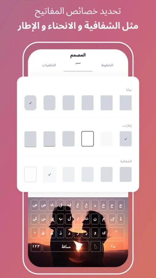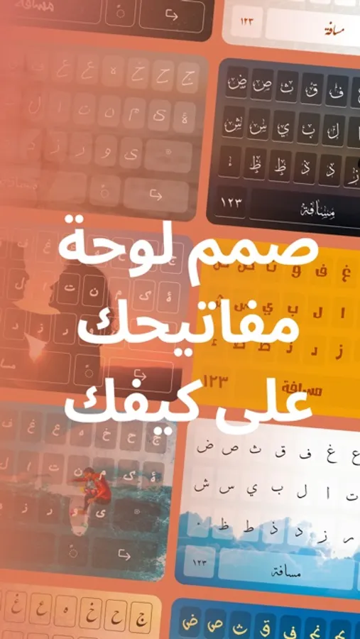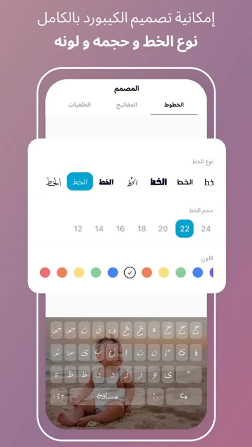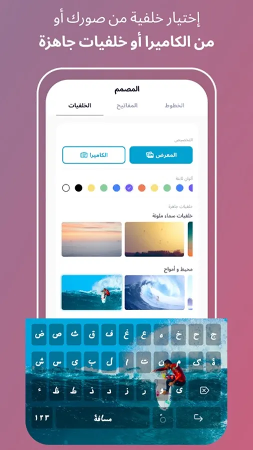 الآن يمكنك تصميم لوحة المفاتيح الخاصة بك واختيار اي صورة او خلفية, بالاضافة الى اختيار خطوط عربية بالوان مختلفة. يمكنك ايضا الاختيار من الخلفيات الجاهزة الموجودة مجانا