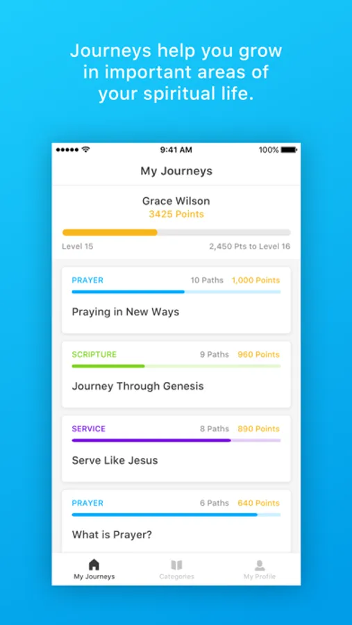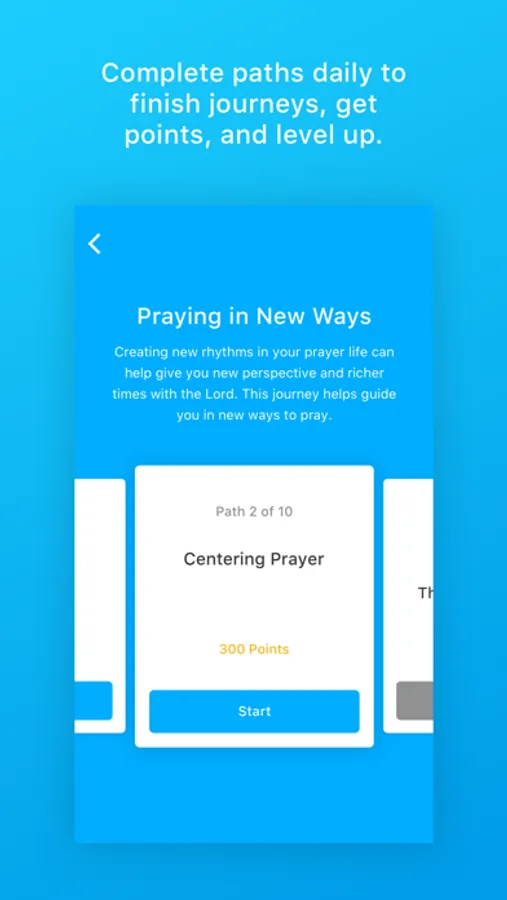 • Complete paths daily to earn points and badges. Not only does this make journeys fun, but it gives you a chance to see the ways that God has been challenging and growing your faith. Badges allow you to see various streaks and milestones you’ve hit while using Atlas. How many Prayer Journeys can you complete? How many days in a row can you work through your journeys?