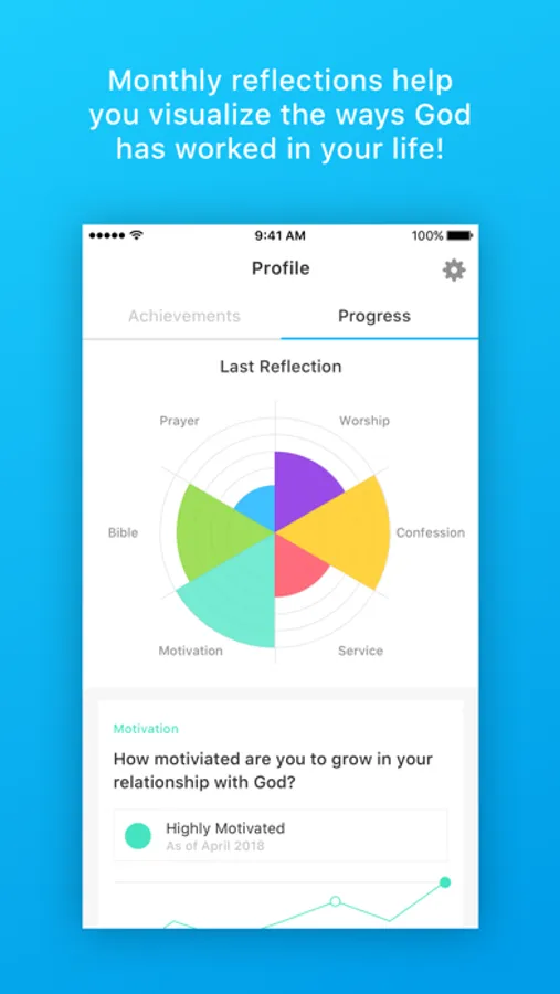 • Through regular reflection exercises, you will be able to actively track how your faith has grown over time. This helps you step back and process your spiritual journey. They are crafted in a way to help you visualize certain areas that God has grown you and areas that He may be calling you to develop further. Each exercise tracks prayer, worship, confession, service, general motivation, and scripture reading. Your previous responses are saved so that you can see the how God has worked in your life over the past months.