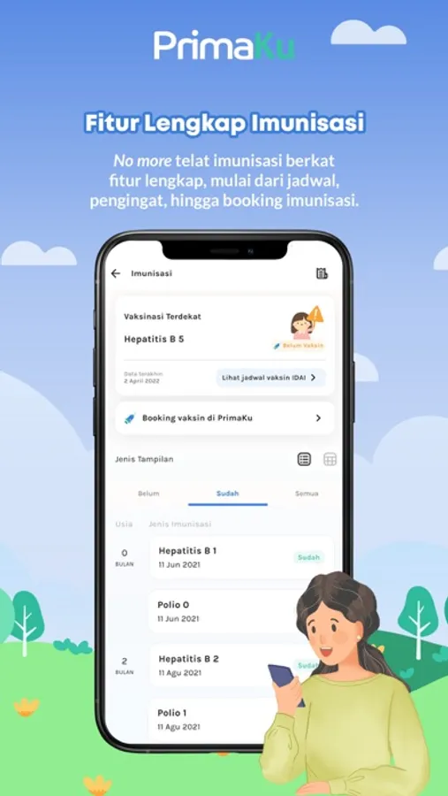 Kalender Imunisasi: fitur ini memungkinkan MomDad untuk mendapatkan jadwal imunisasi berikut pengingat dan pemaparan manfaatnya, mulai dari imunisasi dasar lengkap dan lanjutan serta imunisasi tambahan.