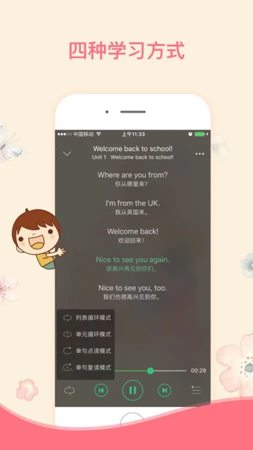 2.具有自动顺序播放,单元循环播放,句子点读,句子点读复读功能。