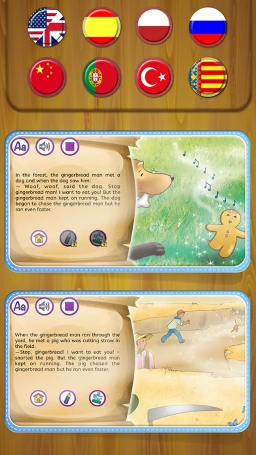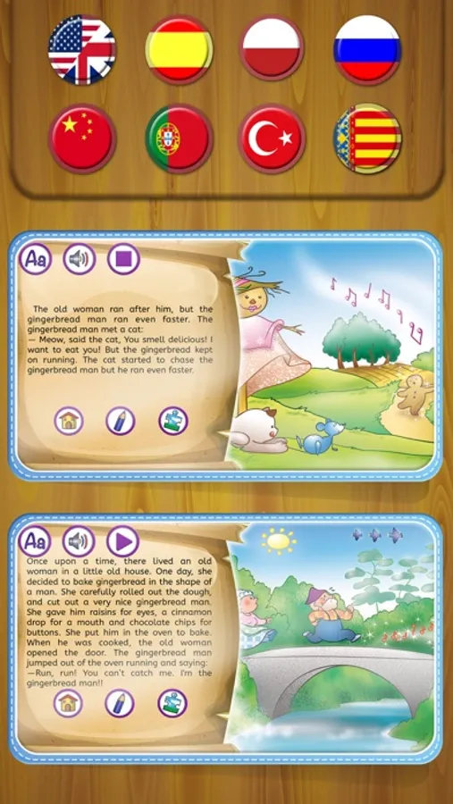 • The story: Read and listen to the story by pressing the audio button to play the sound. The audio is available in English, Spanish, Chinese, Polish, Portuguese, Russian, Valencian and Turkish, accompanied by beautiful background music and sound effects.