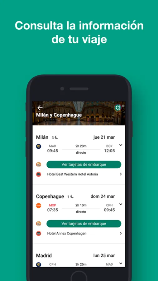 Podrás obtener los billetes en tu móvil de forma gratuita unos días antes de volar, sin tener que hacer múltiples check-ins con las aerolíneas.