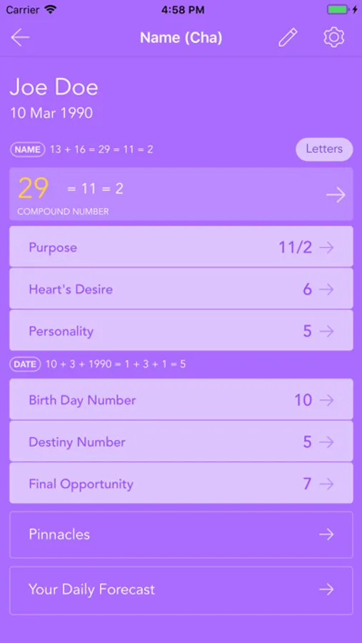 • You can enter birthday to all of your names and you get additional descriptions (according to Chaldean and Pythagorean Numerology)