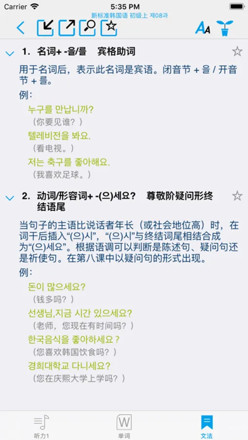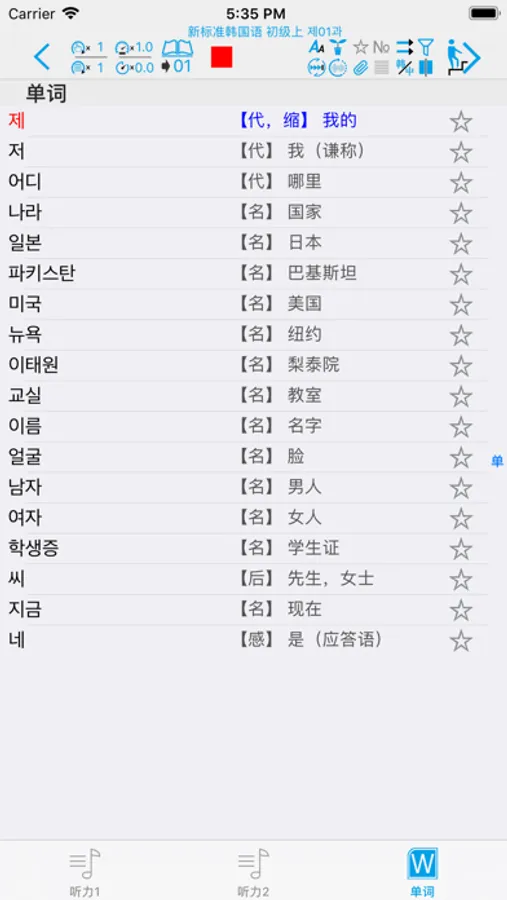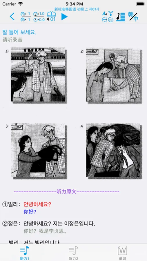 APP参照《新标准韩国语》课程制作而成。包含了初中高上下共6册的课文,听力,单词和语法等4大部分。全部的课文和生词都配有真人的发声。您可以通过手机和平板进行下载。方便任何有需要的朋友方便快捷的学习,能够快速强化您的听,说,读,写能力。本APP集成了超强的复读功能,可以根据自己的需要对每个单词、每句话或者整篇内容进行一遍或多遍的复读,洗脑式的复读可以加强记忆。同时,您还可以在“设置”里进行设置后台播放,方便您在移动中使用。