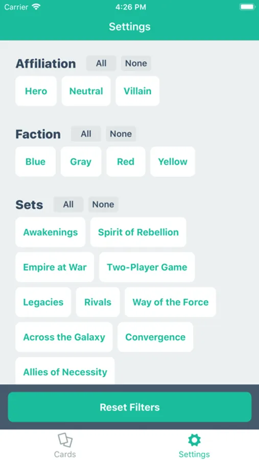 - Filter by affiliation, faction, set, type, subtype, keyword, and rarity