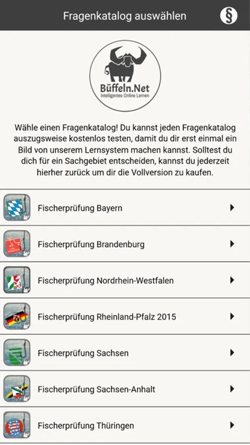 Mit dieser App können für folgende Bundesländer Fragen für die Fischerprüfung bzw. Angelschein gelernt werden: