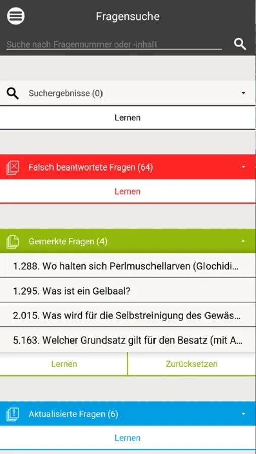 • Einzelne Fragen kannst du markieren und dann separat lernen