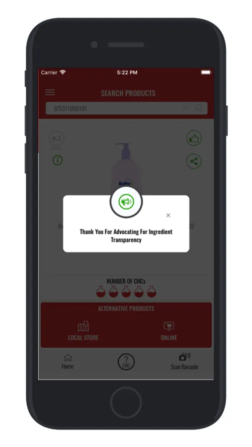 Advocacy Button: This button is enabled when a scanned/search product contains toxic ingredients. Pushing the button sends anonymized email to brands