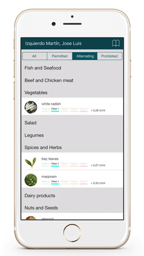 - The laboratory report screen allows you to view all our reports together as a list or use a filter to view foods according to intolerance (permitted, alternating and prohibited).