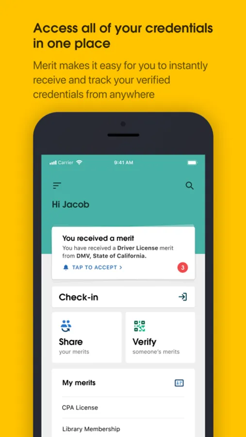 *Accept New Merits -- Receive and accept credentials (in the form of digital merits) from Merit-verified organizations. Every new Merit you receive will appear in your pending tab. Accept them in the App to add them to your profile.