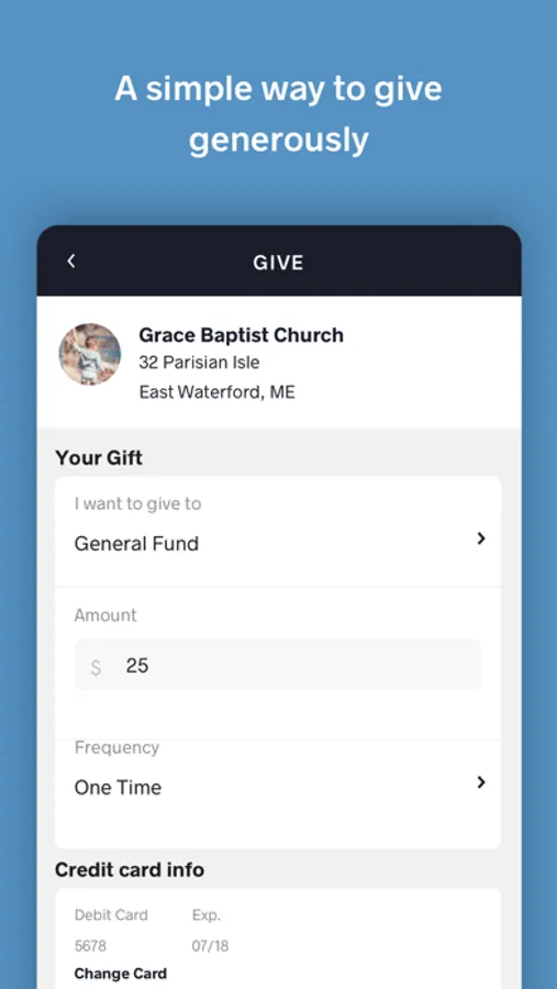 • Give any time, anywhere with Generosity by LifeWay. Our convenient app allows you to give generously to your church if they have subscribed to Generosity by Lifeway. Easily set up recurring donations, participate in exciting initiatives, and see how God uses your gift of generosity to mightily advance His kingdom.