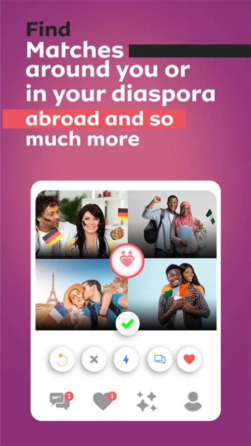 - Find people in your country or diaspora: In your settings, we make it easy to find singles of a specific origin. So come and satisfy that crushed appetite.