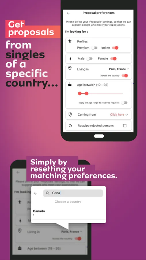 - Customized search: Define your search criteria in your settings and get proposals from singles in a specific country, or define another country and get potential matches in that country. All in a matter of seconds.