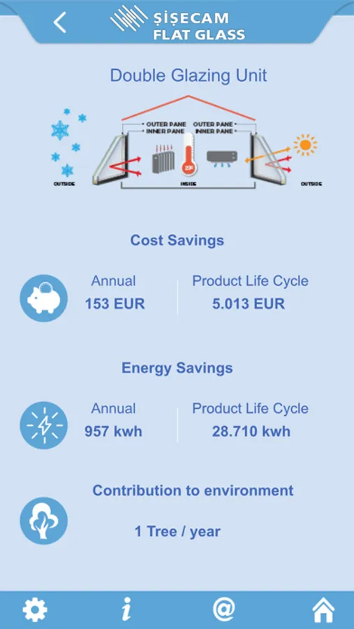 Besides right glass solution recommendations, you can also see the heating and cooling energy savings per year and throughout the life of the building.