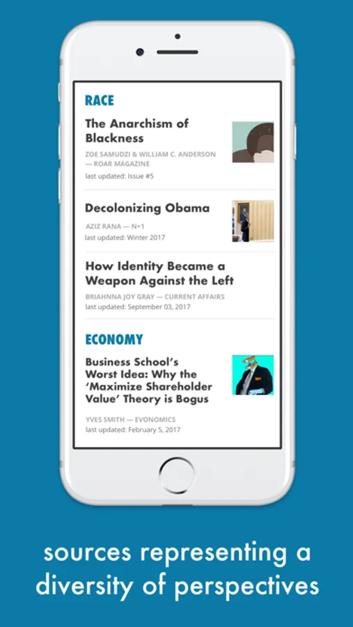 Contents spans from news, politics and policy to culture, art and identity - balanced across the US and global perspectives - and covering everything the economy, international relations, the environment, and social justice. All content is curated from a select set of progressive publications including magazines, think tanks, investigative journalists, blogs, research institutes and more.