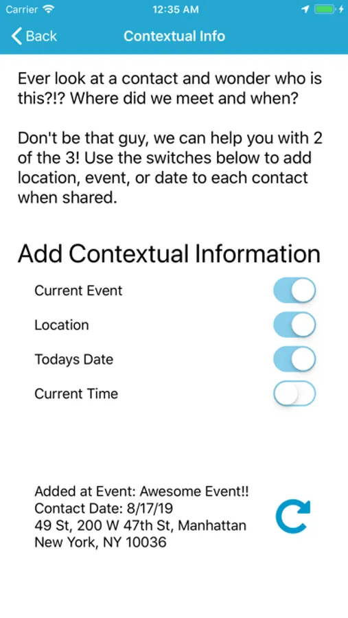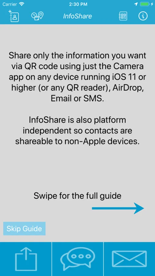 InfoShare allows you to share just the information of a contact you want to. Share via QR code(anyone with a QR reader or iOS11 can use the camera app), AirDrop, email or text. InfoShare also gives you the ability to add contextual information, so your new connections will know where and you met. InfoShare is also platform independent so contacts are also shareable to non-Apple devices.