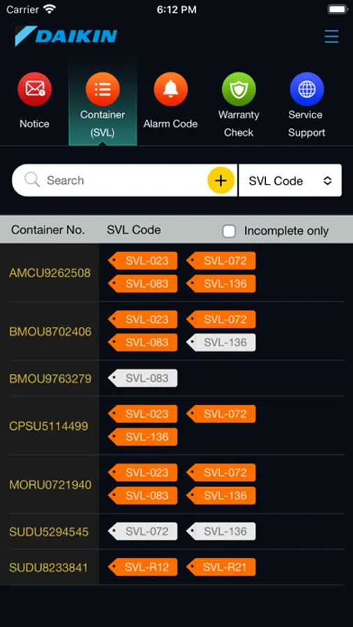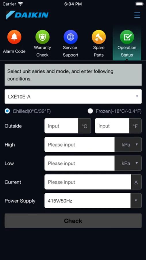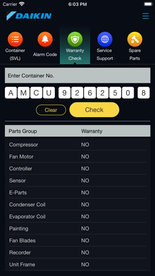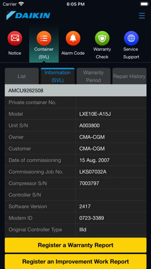 It is possible to check some basic information (specification information) of the container unit, warranty period, and then easy to search alarm codes notified by the container unit to carry out troubleshooting quickly when a problem occurs.