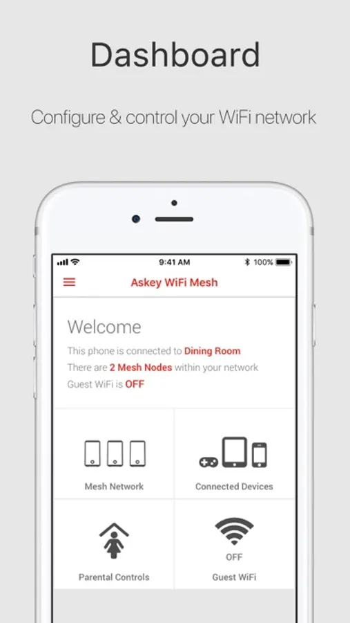 The perfect companion of the Askey WiFi Mesh Solution. The Askey WiFi Mesh App gives you total control of your in-home WiFi network. Thanks to this App, you get to know and manage pretty much everything about your WiFi network. Name your WiFi devices and place them in the different rooms. Easily choose your WiFi network's name and password. Check your connection speed. Create special credentials and give access to your visitors. Define Parental Controls and schedule on/off WiFi connection times.