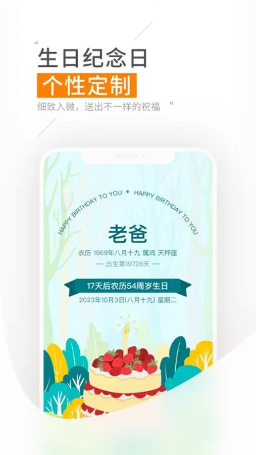 【生日提醒】记录生日、纪念日,查看星座、属相、五行、生辰八字等详细生日信息,你能自由的开启公、农历,满月,百天,半岁生日的提醒。可以设置生日、纪念日预提醒,还可以在生日当天,发送由你署名的祝福短信。