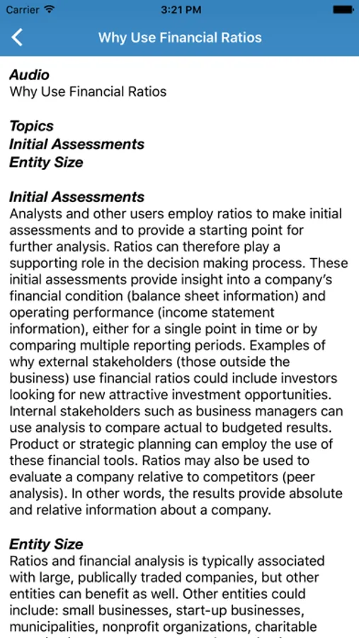 Aspiring financial analysts, CFAs, accountants, CPAs and MBAs can benefit from these lessons. This app will become a professional reference long after a CFA, CPA, or degree is obtained. The core content covers lessons that should be learned so that students and professionals can move into financial statement analysis.