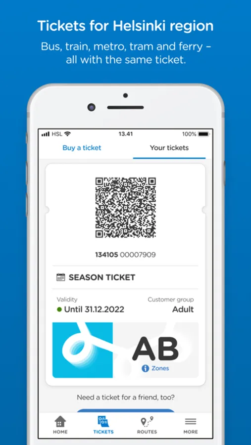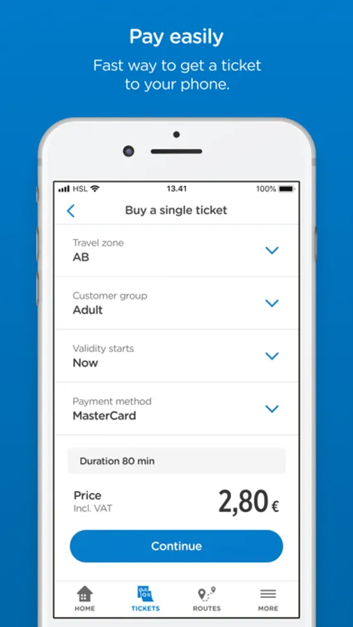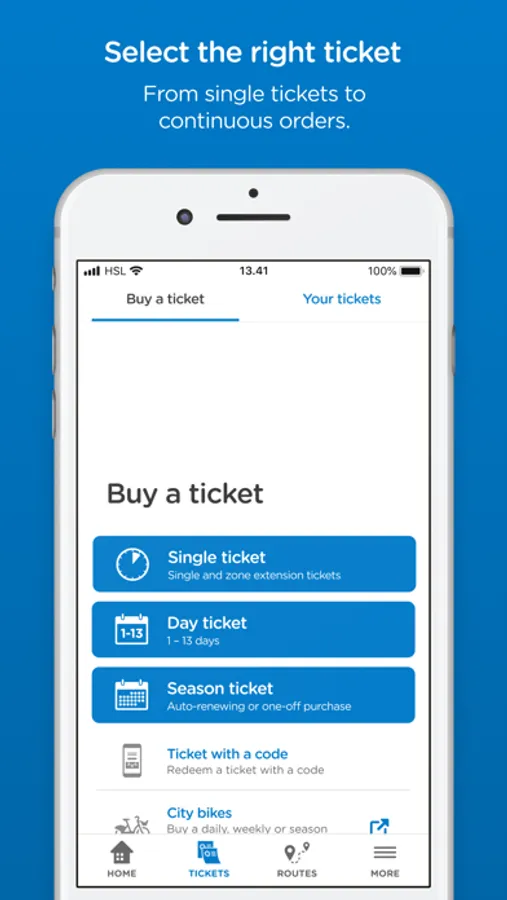 With the HSL app you can buy tickets for Helsinki region public transport, find the best routes and get targeted traffic information. In the HSL app you will find e.g. single, day and season tickets for both adults and children. Bus, train, metro, tram and ferry – all with the same app. You can pay easily e.g. with a payment card.