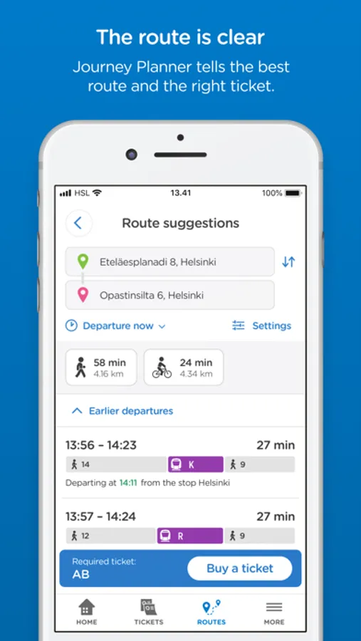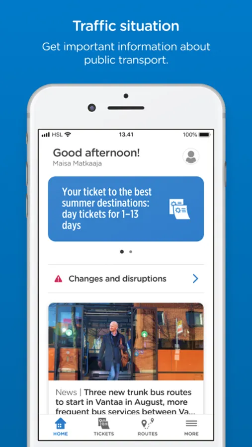 In addition to tickets, there is also a journey planner in the HSL app. Journey planner tells you e.g. the best route and the ticket, which is needed for the route. In the HSL app, you can also see up-to-date transport information for the areas and lines you have selected.