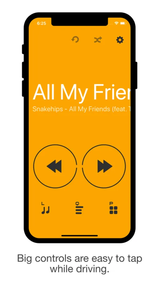 The controls are giant and easy to see and hit without taking your focus away from the road (for example the huge scrolling song title is also the play/pause button). You can swipe anywhere on the screen to skip tracks without even looking at your phone.