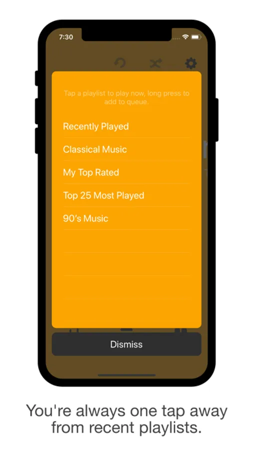 The button to pull up your playists is always on the main screen, and your most recently-played playlists are always listed first. You can also always easily access buttons to control shuffle and repeat modes, pull up and edit your current queue, and access your library without having to hunt for fiddly buttons or navigate menus. Tap songs to play now, or long-press to play next in your queue.
