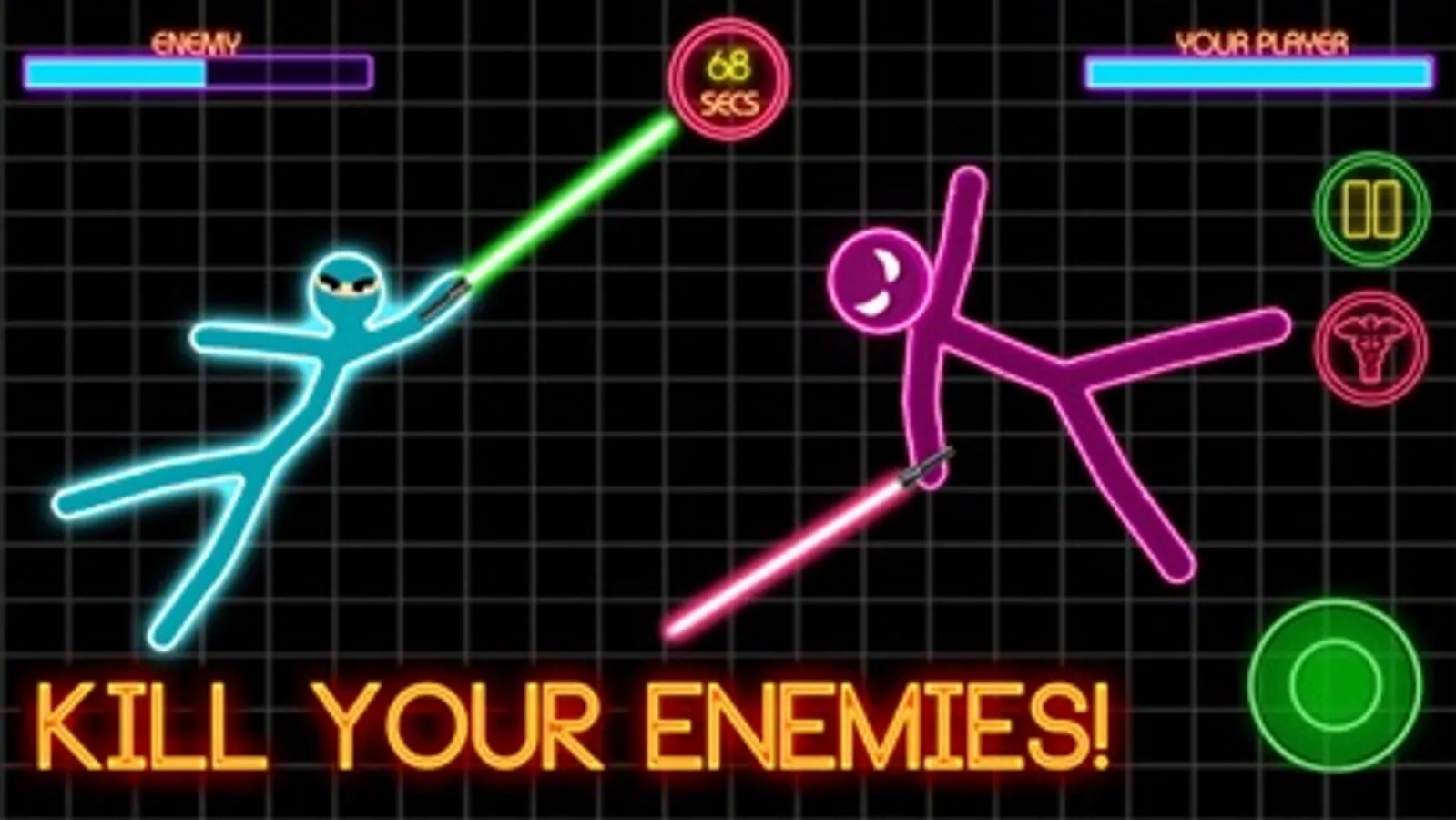 This is the ultimate chance to show your heroic skills when warriors attack vigorously. Glowing sticks and other neon weapons are available. Avoid the enemies and Survive. Experience the real fight and neon atmosphere in the best stickman game! Use your skills and tricks to crash the warriors, destroy them and win this Epic fighting game.