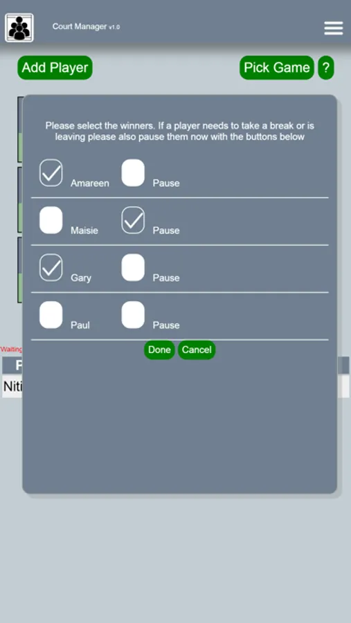 Players can be paused and resumed at any time to exclude them from being picked for a game.