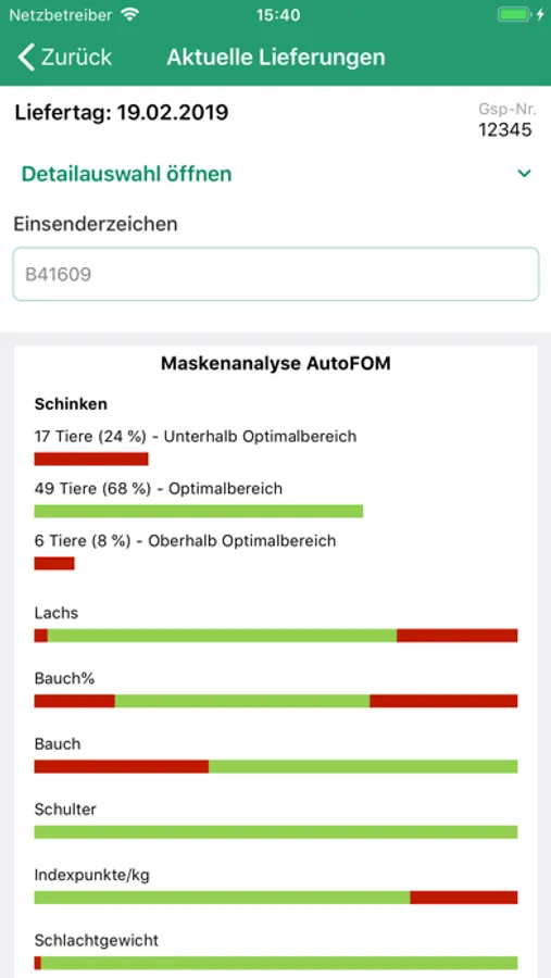 Wie aus dem Extranet gewohnt, können Sie Ihre Schlachtergebnisse der Lieferpartien für die Tierarten Schwein, Großvieh und Kalb jederzeit mit dem Westfleisch-Durchschnitt abgleichen. Die tabellarische und grafische Darstellung bietet Ihnen einen schnellen Überblick über die wichtigsten Leistungs- und Gesundheitsparameter Ihrer Lieferpartie.